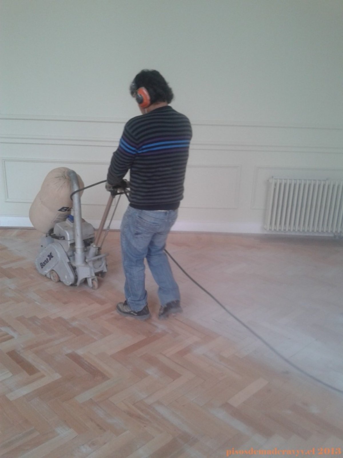 La maquina que se utiliza para este trabajo se llama pulidora, y es únicamente para pisos de madera pesa alrededor de 120 kilos y es del tipo industrial, usa aproximadamente de una a cinco lijas, ya que con estas el piso se empareja, el numero de lijas depende del estado del piso si es nuevo o usado. Es necesario para un buen vitrificado que el piso esté pulido.